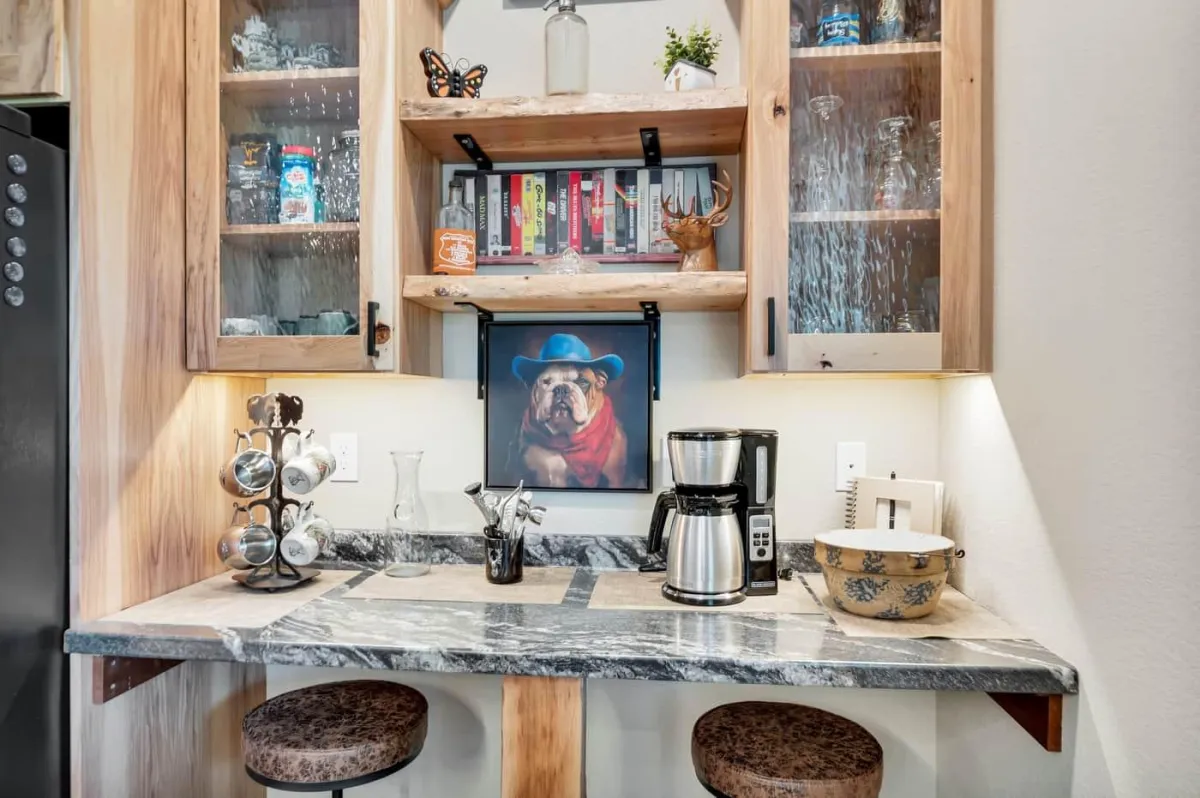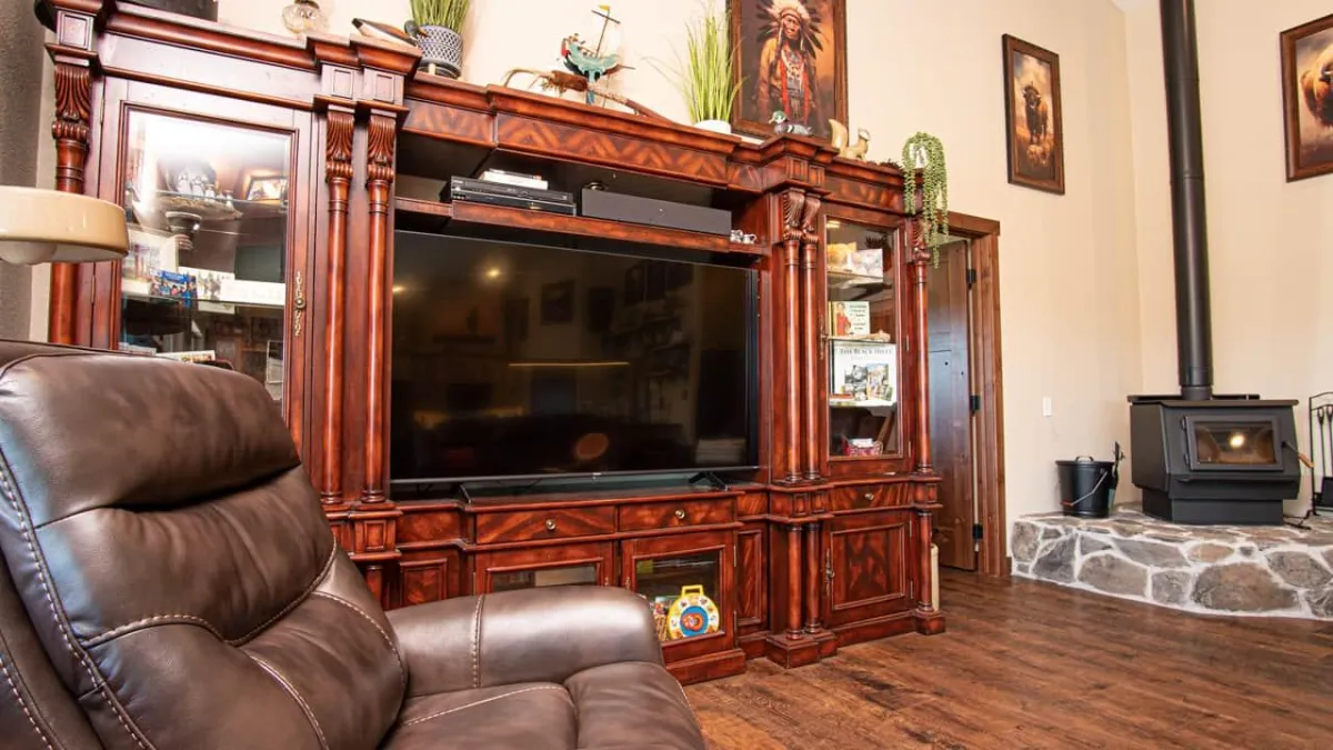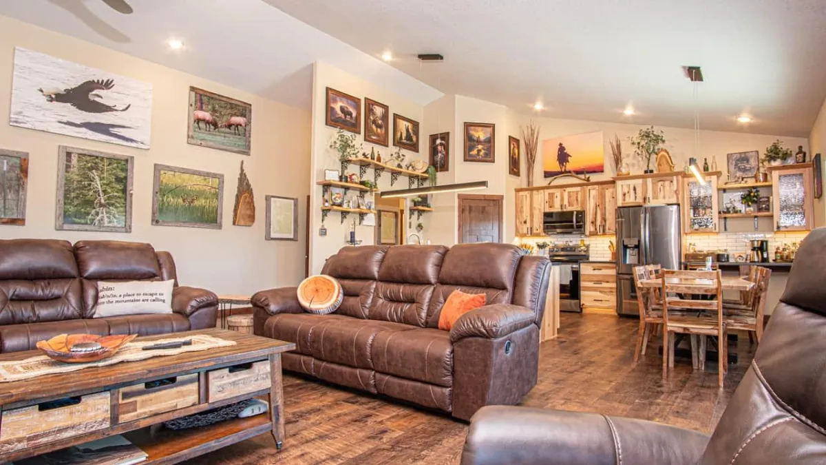 Nestled just off Roubaix Lake Road and Highway 385, The Lodge at Roubaix Lake offers a serene escape for families and groups alike. This expansive 3,000 sq. ft. single-level home features four bedrooms, each with a king-sized bed, and 2.5 bathrooms, providing ample space for relaxation and adventure. Extensive windows throughout the lodge showcase breathtaking mountain vistas and frequent wildlife sightings, including elk, deer, and wild turkeys at dawn and dusk.